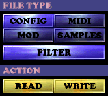 This is where all the reading and writing of files in 2MIDI takes place. To read/write a file, first you must select which type of file it is that you want to read/write. Then you can use the file selector to select a file, or you can enter a path and filename in the path box (at the top of the file selector)